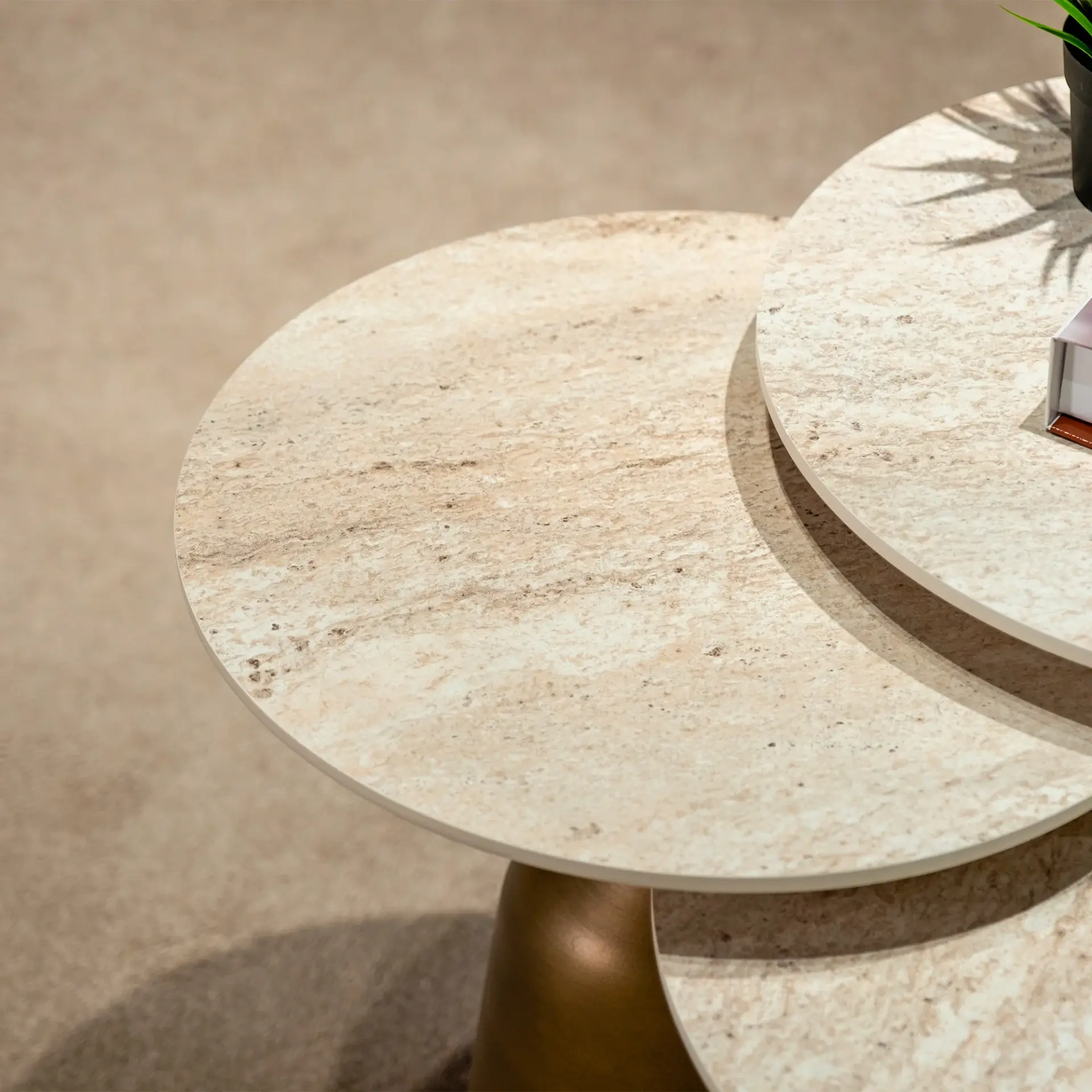 Beige Zigon Sehpa, sade ve zarif tasarımıyla modern yaşam alanlarına ferahlık kazandırır. Traverten üst tablası ve pirinç renkli metal ayaklarıyla hem şık hem de dayanıklı bir görünüme sahiptir. 3’lü set formuyla sunulan bu zigon sehpa, hem dekoratif hem de fonksiyonel kullanım için ideal bir seçenektir.