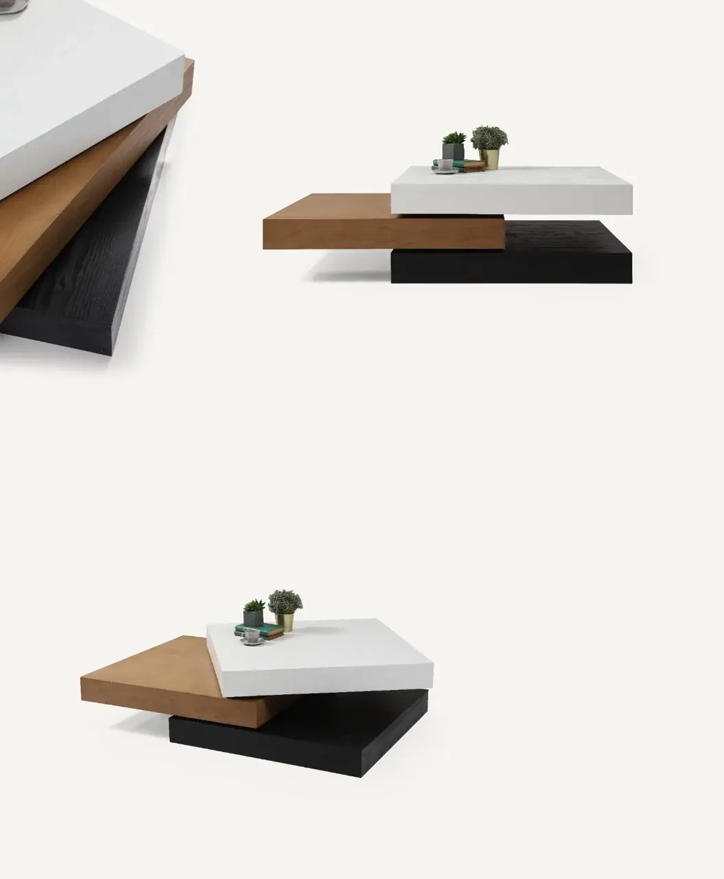 Taba Home olarak yaşam alanlarınıza hem estetik hem de işlev kazandıran yepyeni bir kare model sunuyoruz. Triple Kare Orta Sehpa, üç katmanlı kare üst yüzeyiyle modern ve şık bir görünüm sunar. Dayanıklı MDF malzeme kullanımıyla uzun ömürlü kullanım sağlar. Siyah rengi ve ceviz ayaklarıyla salonunuza zarif bir dokunuş katar.